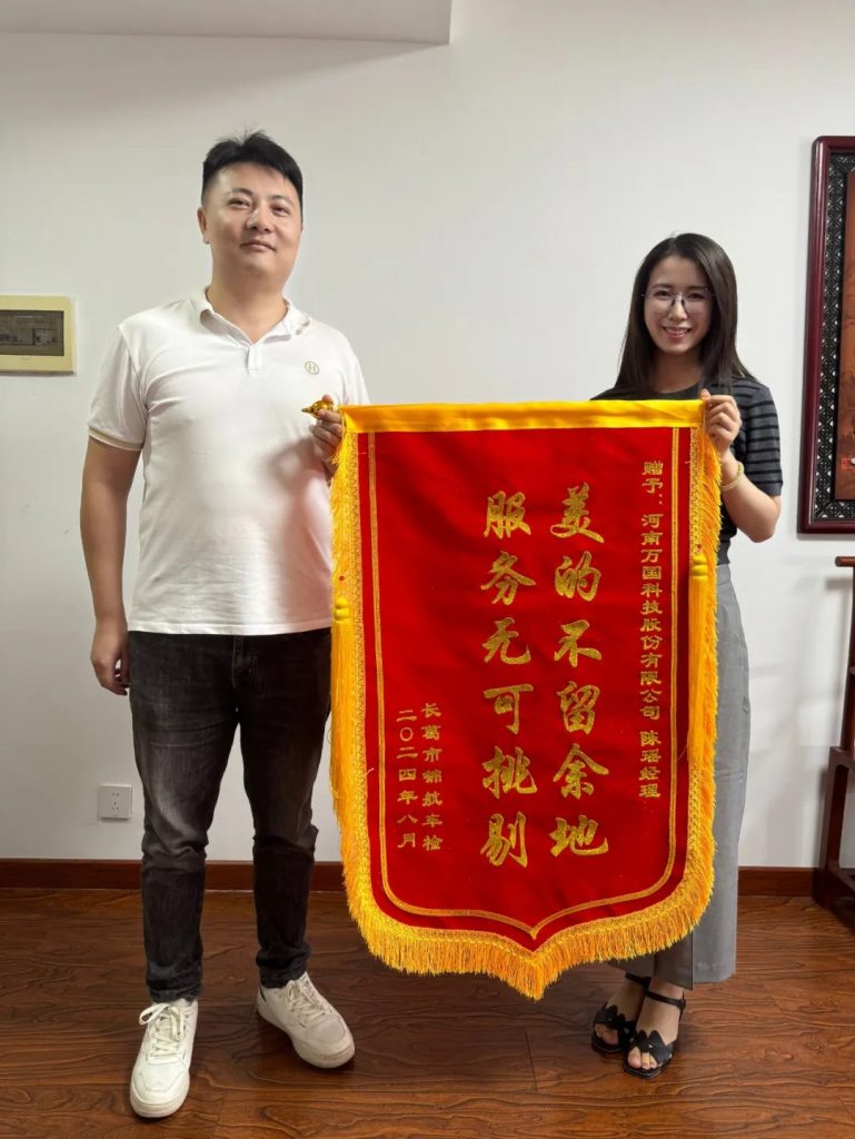 優(yōu)質(zhì)的服務(wù)是真誠的付出,客戶的稱贊是幸福的收獲。2024年8月30日,河南萬國科技股份有限公司市場部陳瑤經(jīng)理收到了一份珍貴的禮物,一面鮮艷的錦旗。寫有“美的不留余地,服務(wù)無可挑剔”的錦旗是客戶對萬國服務(wù)的最好稱贊。